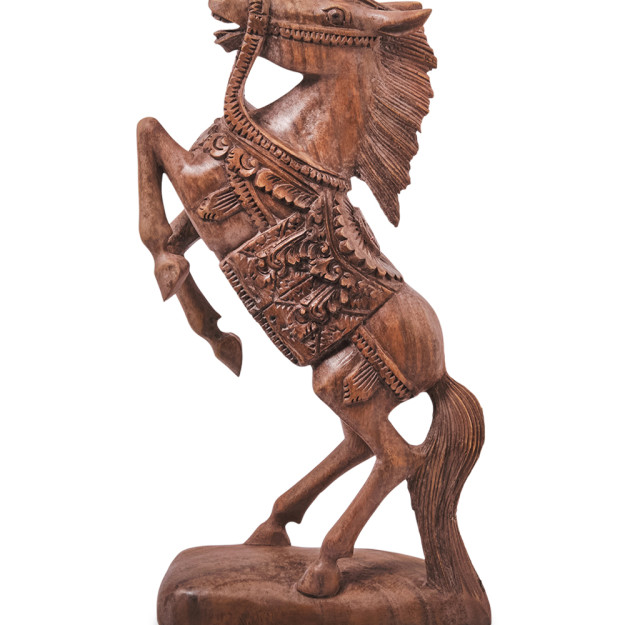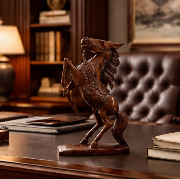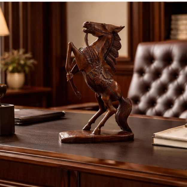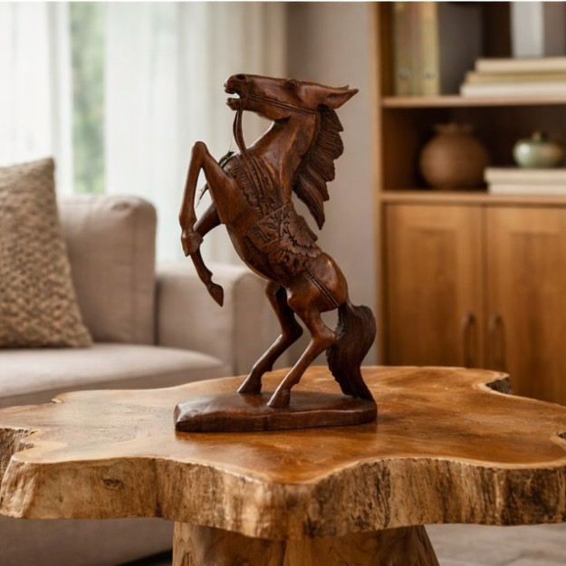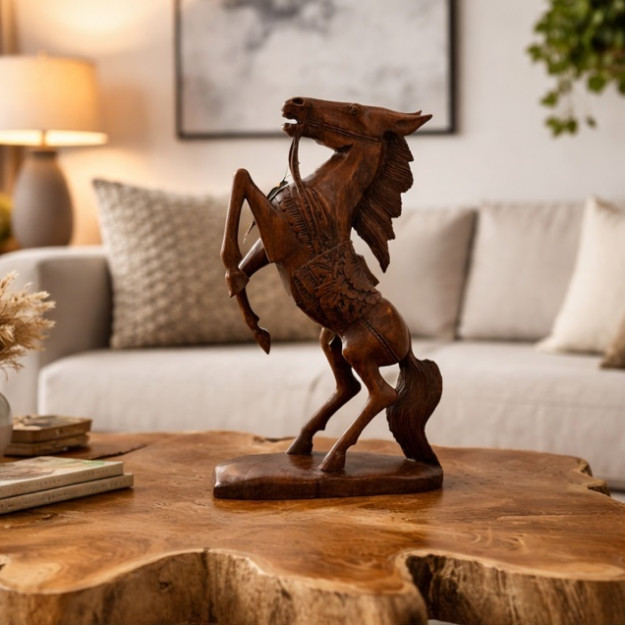 Древесина суар — неслучайный выбор. Плотная, прочная, с глубоким тёплым оттенком, она словно создана для воплощения сильных образов. Каждый сантиметр этой 45-сантиметровой скульптуры дышит движением. Грива развевается, мышцы напряжены, взгляд устремлён вперёд.